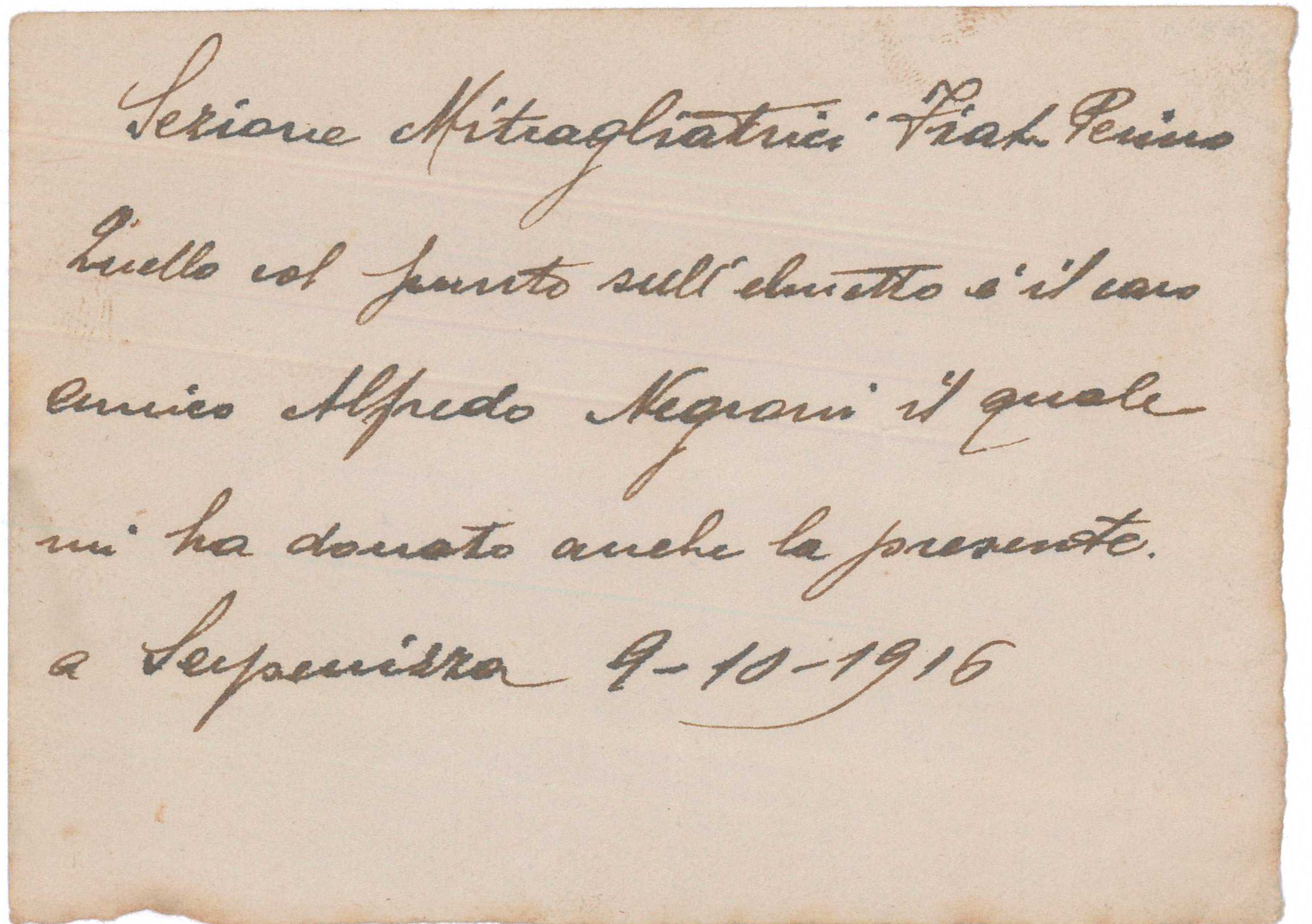 Quello col punto sull’elmetto è il caro amico Alfredo Negroni il quale mi ha donato anche la presente a Serpenizza 9-10-1916