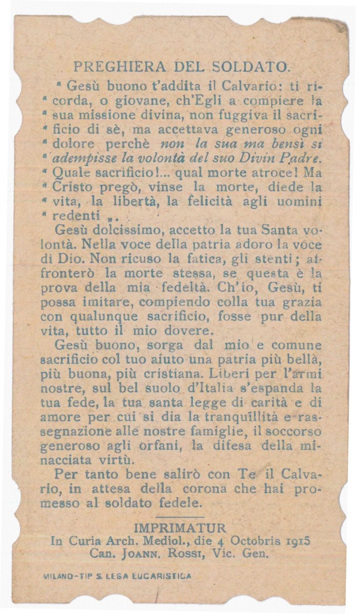La prima Immagine Sacra, forse del 1915, porta sul retro una “Preghiera del soldato”.