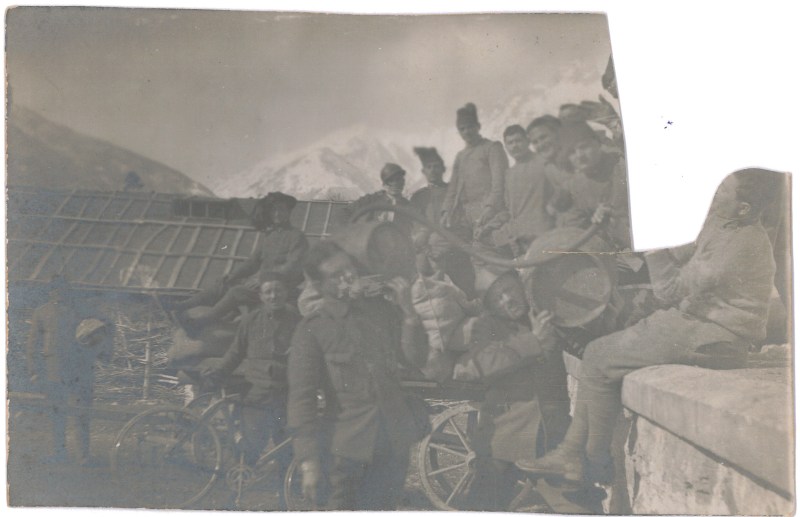 Ci sono ritratti soldati di corpi diversi. Quelli con il fez sono bersaglieri. Come abbiamo già scritto in un altro posto, quelli che portavano questo copricapo particolare tenendolo dritto, venivano chiamati in gergo “turchi”. Siamo in alta montagna. Sullo sfondo potrebbe essere il Monte Nero o il Triglav, chissà (qualcuno può aiutarci?). Silvio Minto del Gruppo facebook “La Grande guerra 1915 – 1918” ipotizza essere il Monte Mrzli conosciuto anche come Monte Smerle (effettivamente nominato varie volte da Flavio).