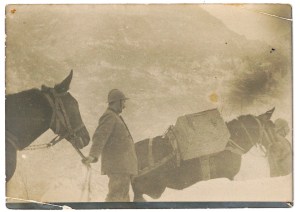 Oggi, solstizio d’inverno, pubblichiamo una immagine in qualche modo “a tema”. La fotografia ritrae Flavio e un suo commilitone che conducono due muli carichi di materiale. Il paesaggio alle loro spalle è imbiancato e i due bersaglieri sono circondati da cumuli di neve.