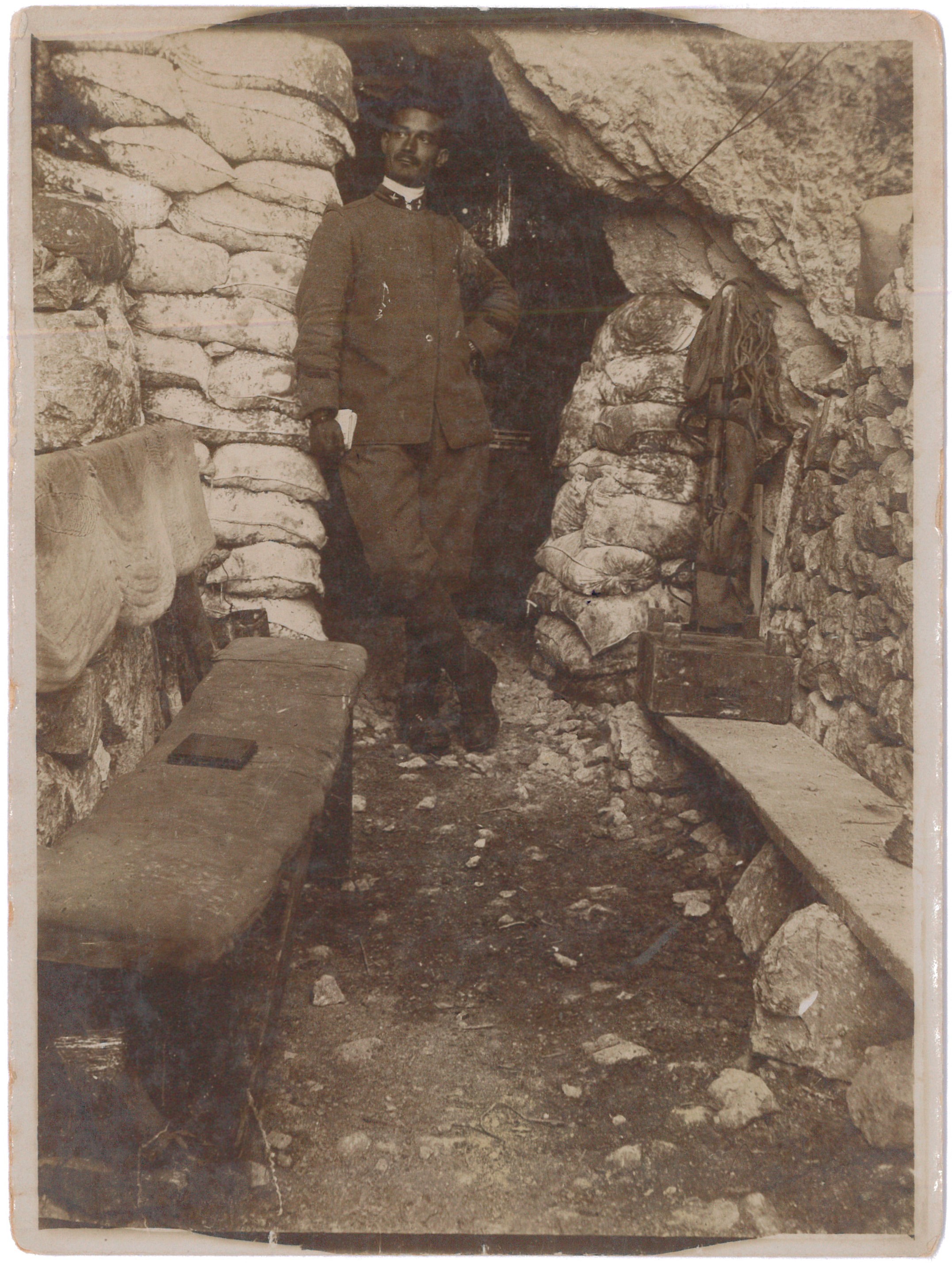 Non abbiamo ulteriori informazioni, purtroppo. Ma gli esperti notato tante cose anche in una foto come questa. Tra i particolari che ci fanno notare: il ricovero/trincea molto curato e ben messo, il libro sulla panca coi sedili imbottiti e lo schienale, forse a disposizione di chi viene in visita. I sacchi che hanno assunto la forma e il colore della pietra. E anche che la fotografia è stata stampata al contrario, vedendo l’abbottonatura della giacca.