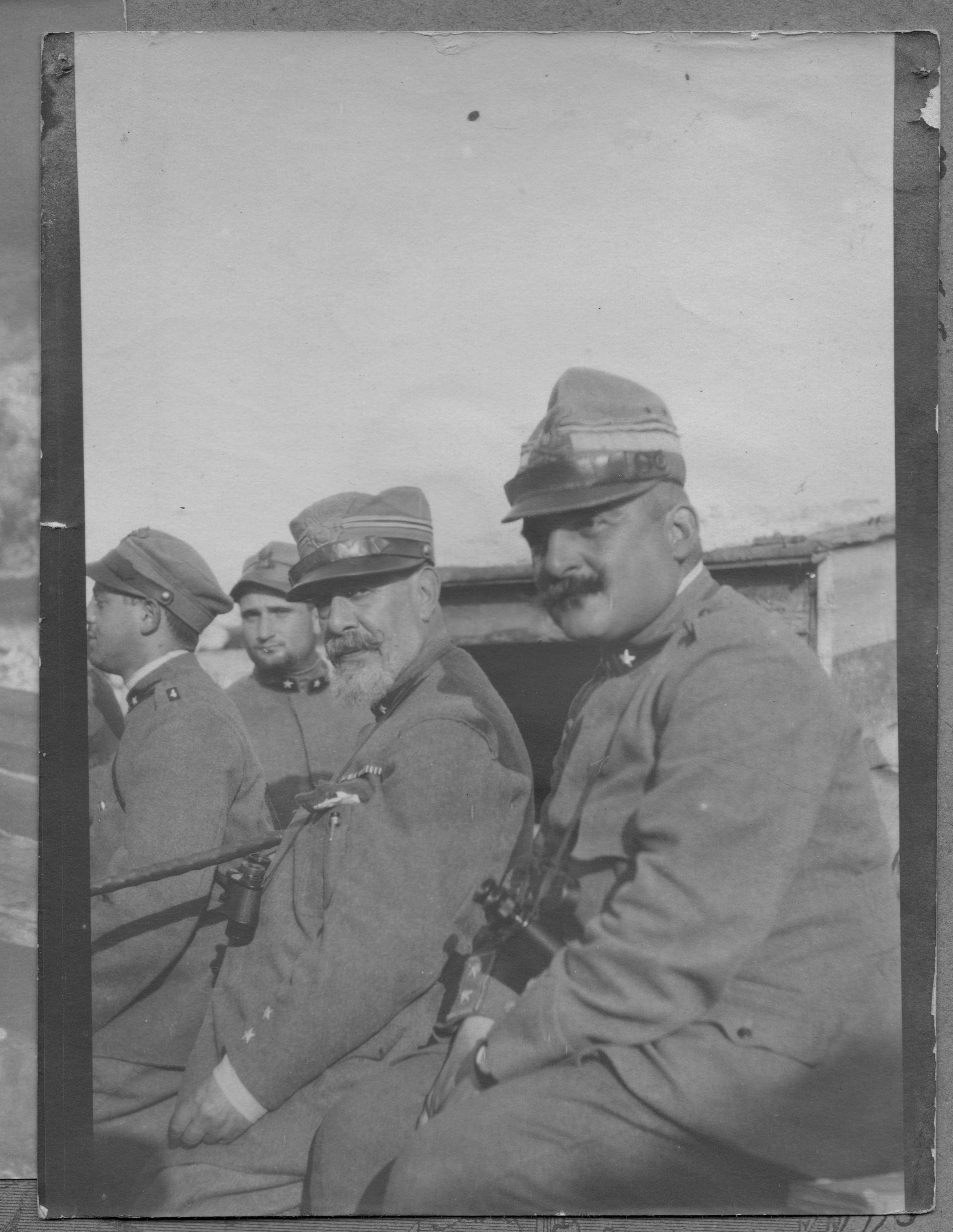 In secondo piano altre tre persone. La prima è un un Tenente dei Bersaglieri all’apparenza abbastanza avanti negli anni. Potrebbe essere un richiamato. Sul fregio del berretto il numero 2. Poi, in parte fuori dall’inquadratura, un bersagliere. Sembra non avere galloni al berretto, quindi non dovrebbe essere un ufficiale. Infine, sullo sfondo, di nuovo un militare di artiglieria o genio, sul berretto sembra avere un gallone nero, aspirante.