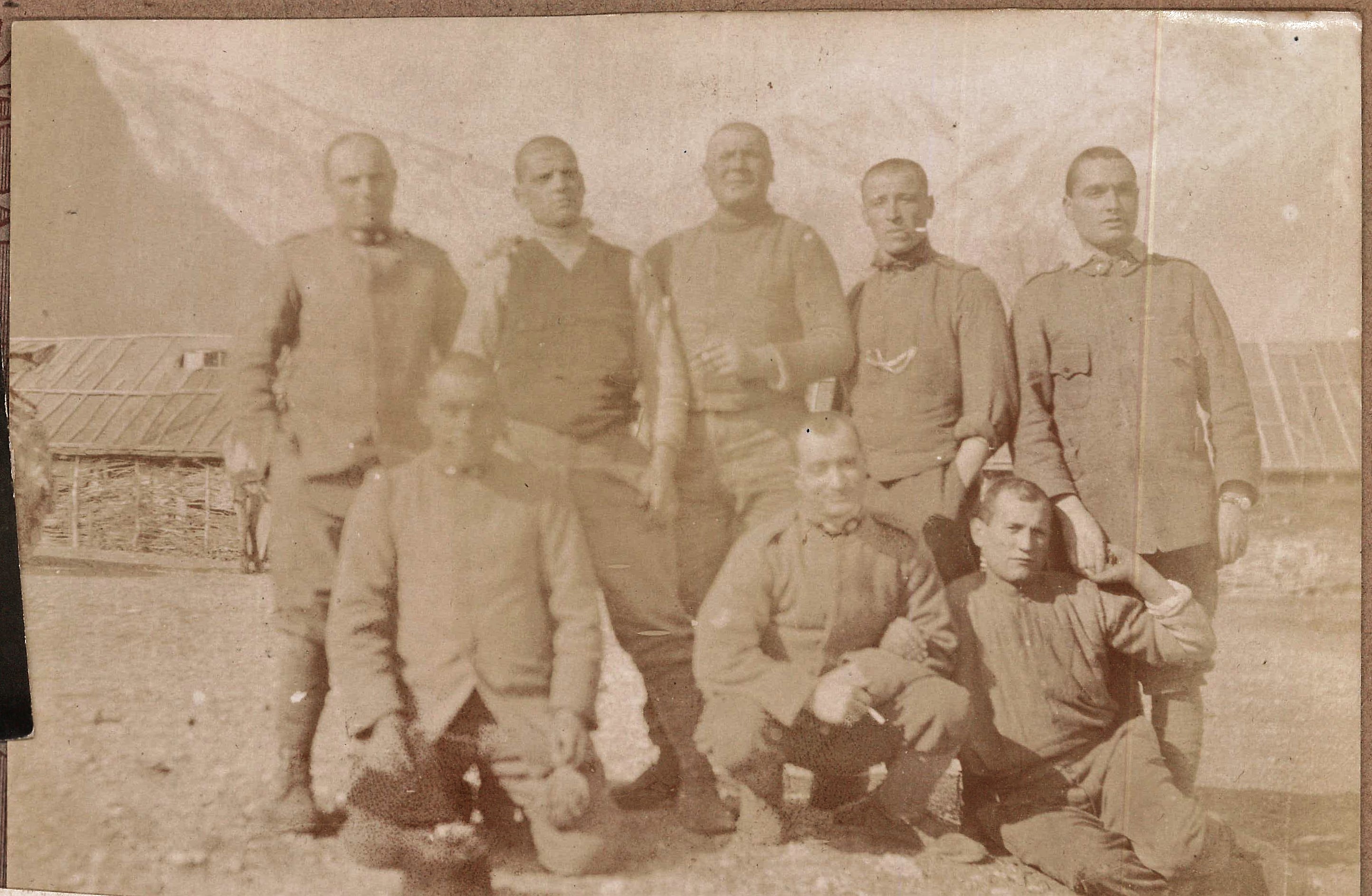 Alle loro spalle dei baraccamenti (quelli di Serpenizza?) e poi sullo sfondo delle montagne. Il luogo sembrerebbe somigliare a quello in cui era stata scattata un’altra foto di gruppo.
