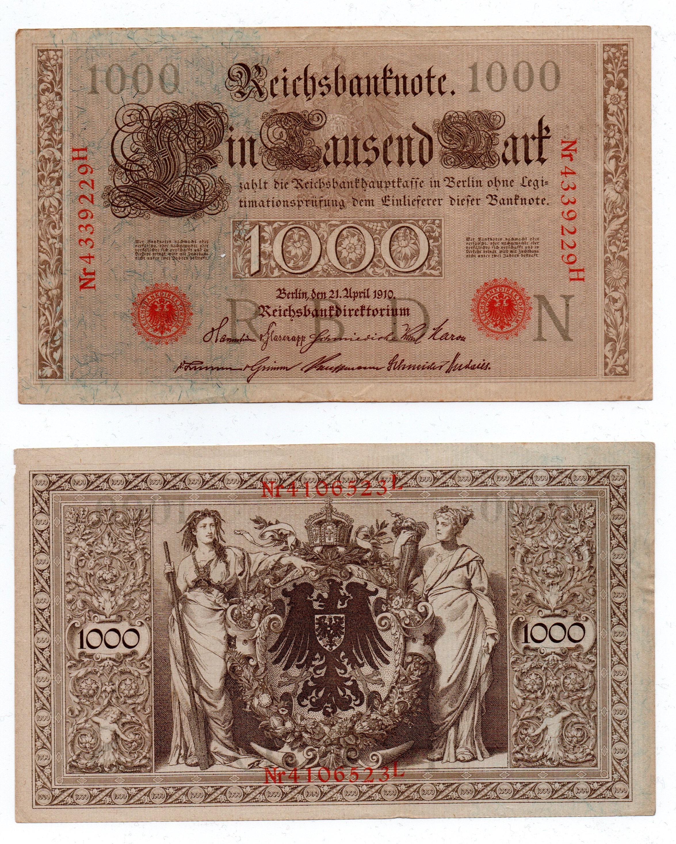 Tra le ultimi oggetti trovati tra i ricordi di famiglia, quattro banconote da 1000 Reichsmark. Sono quindi Marchi tedeschi. La serie emessa nel il 4 aprile 1910 comprendeva anche banconote da 20, 50 e 100 Marchi. Queste in particolare sono della serie con “Sigillo Rosso” che sappiano essere state stampate prima dell’inizio della guerra al contrario di quelle con “Sigillo verde” che pur riportando la data 1910 furono stampate solo dal dicembre 1918.