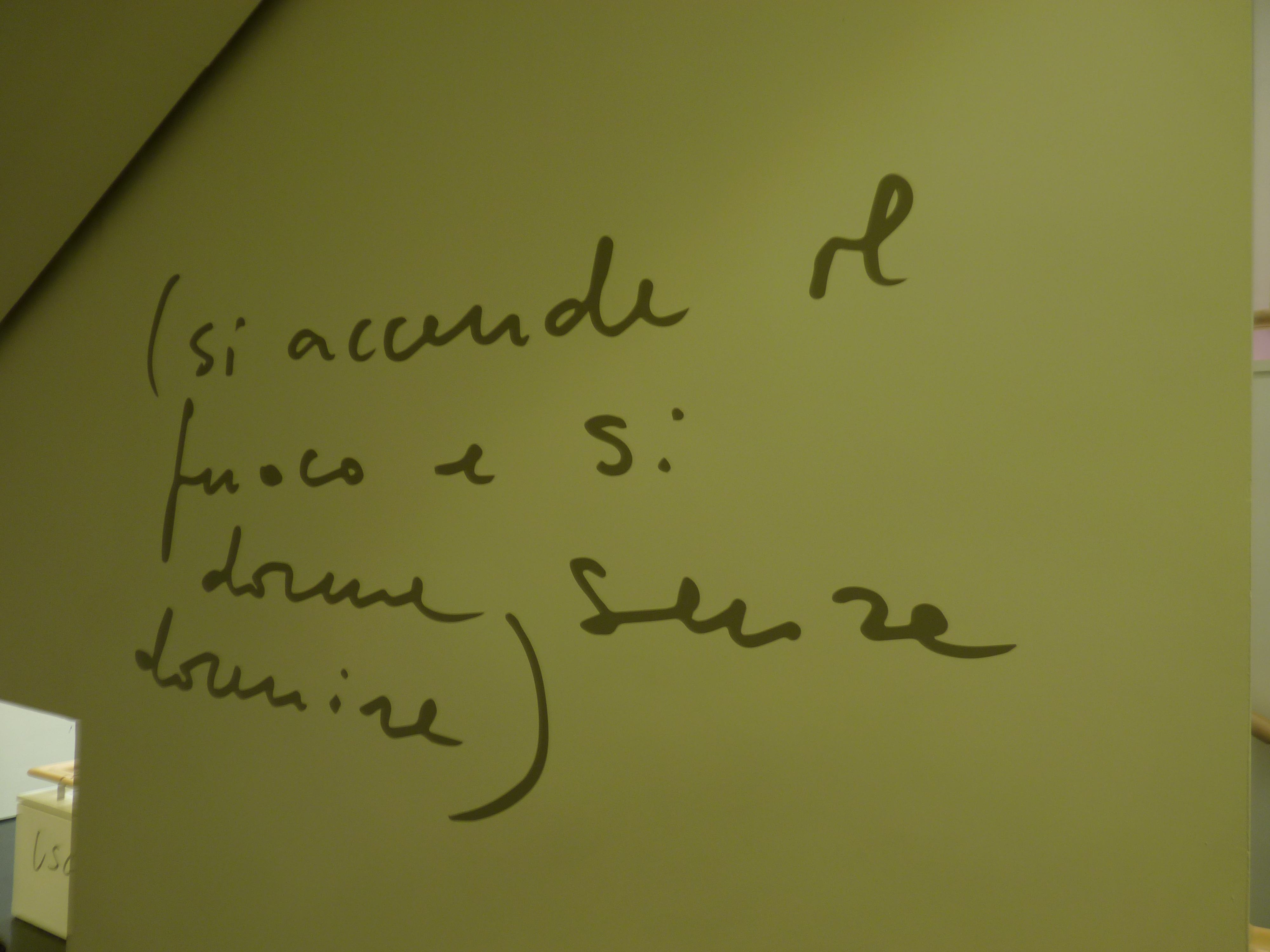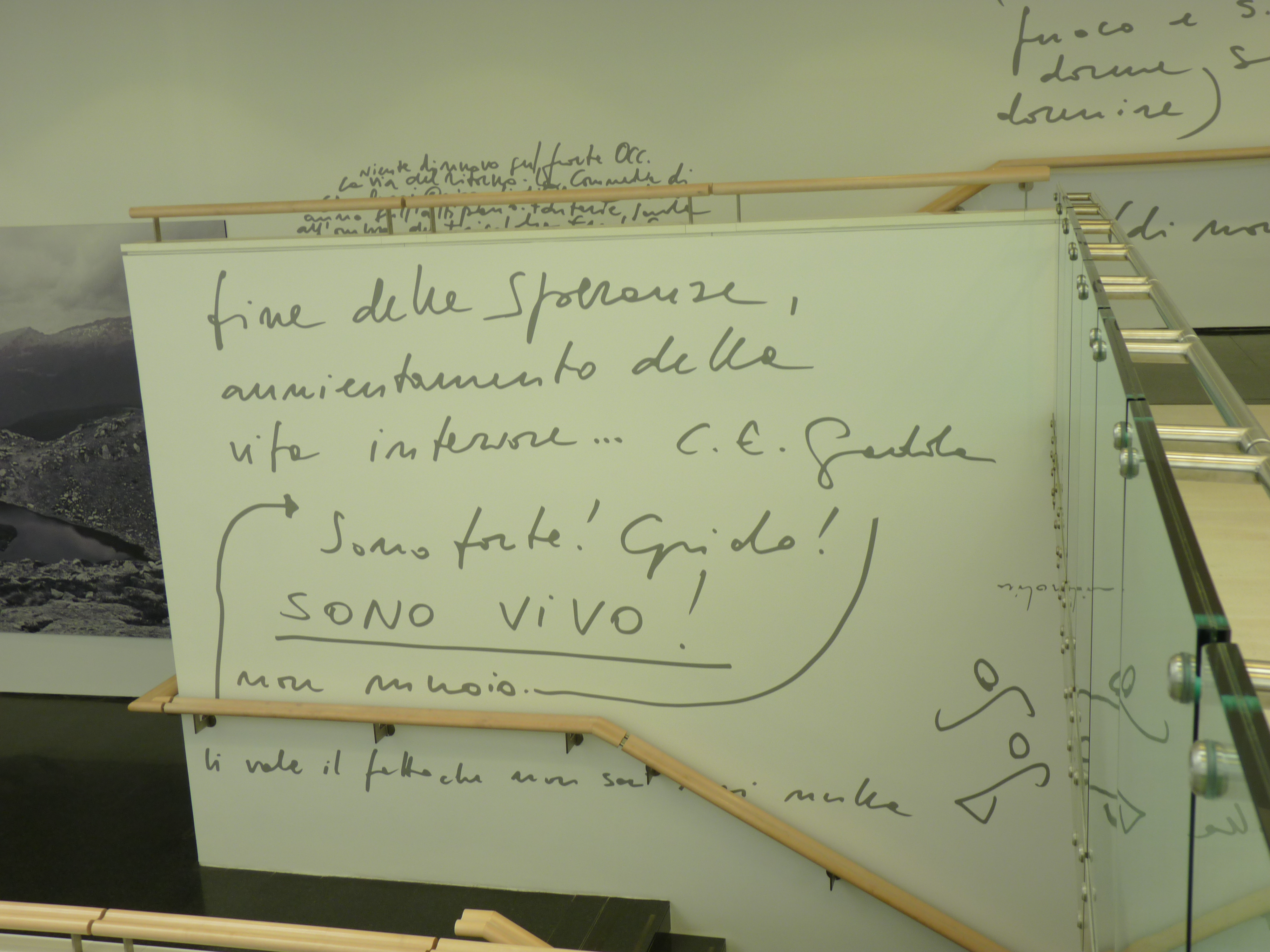 Le scritte compaiono su ogni parete, dietro ogni angolo, nell’atrio di ingresso come lungo le scale, creando un effetto immersivo nelle parole di questi soldati che sembrano riecheggiare in tutto l’edificio, in realtà avvolto in un rispettoso silenzio.