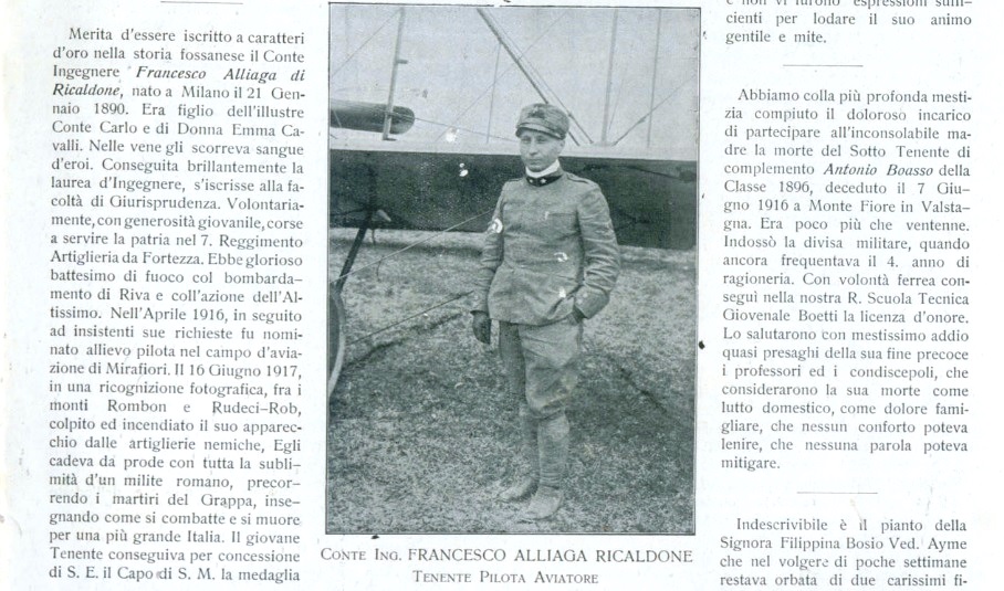 A Francesco Alliaga di Ricaldone, candidato a passare agli apparecchi da caccia, era stata da pochi giorni concessa la medaglia d’argento al Valor Militare che fu poi consegnata alla famiglia il 2 giugno 1918.