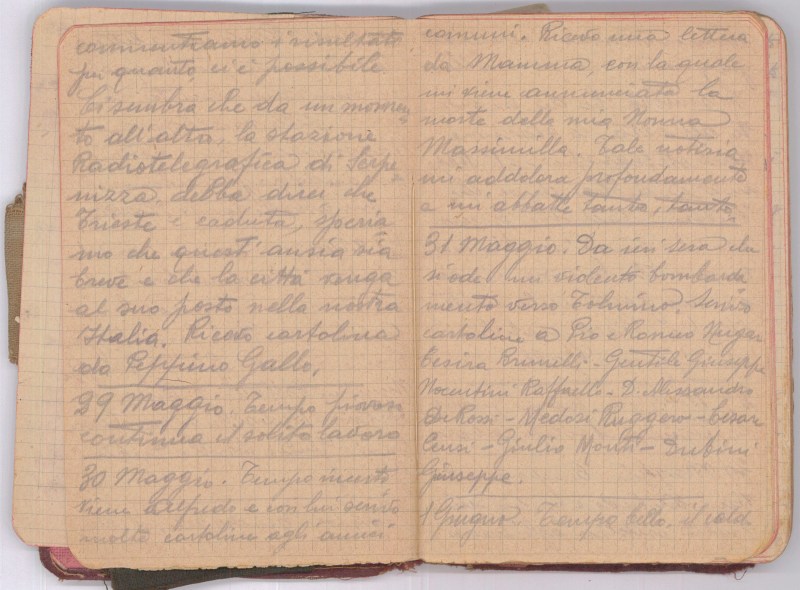 Da ieri sera che si ode un violento bombardamento verso Tolmino. Scrivo cartoline a Pio e Romeo Nugari, Cesira Brunelli – Gentile Giuseppe, Nocentini Raffaello D Alessandro De Rossi –…