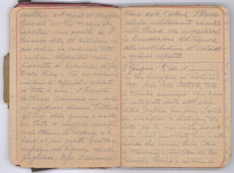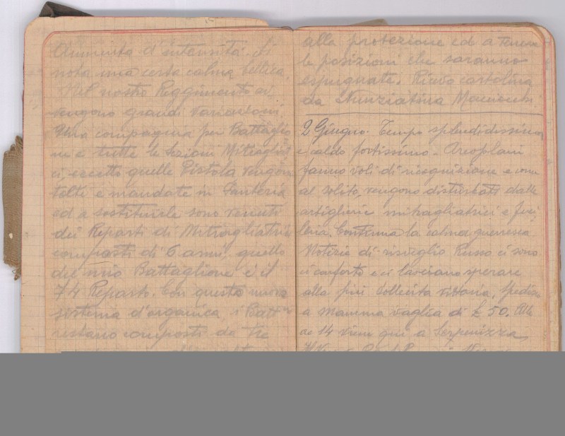 Tempo bello, il caldo aumenta di intensità. Si nota una certa calma bellica. Nel nostro Reggimento avvengono grandi variazioni, una compagnia per Battaglione e tutte le Sezioni Mitragliatrici, eccetto quelle…