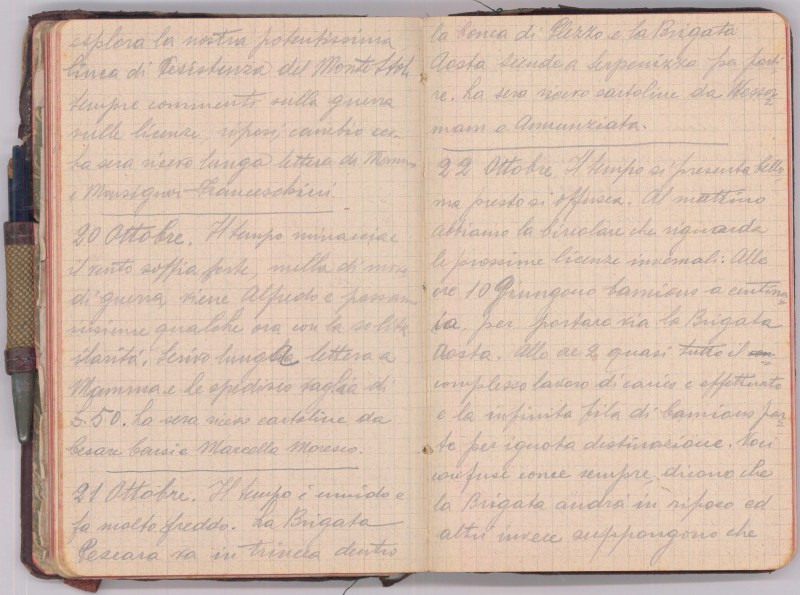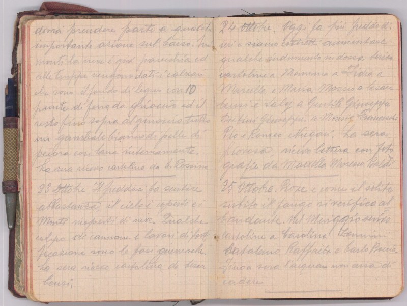Anche oggi piove ma meno di ieri. I monti si fanno sempre più bianchi di neve e le costruzioni per i ricoveri invernali si intensificano. La sera ricevo lettera da…