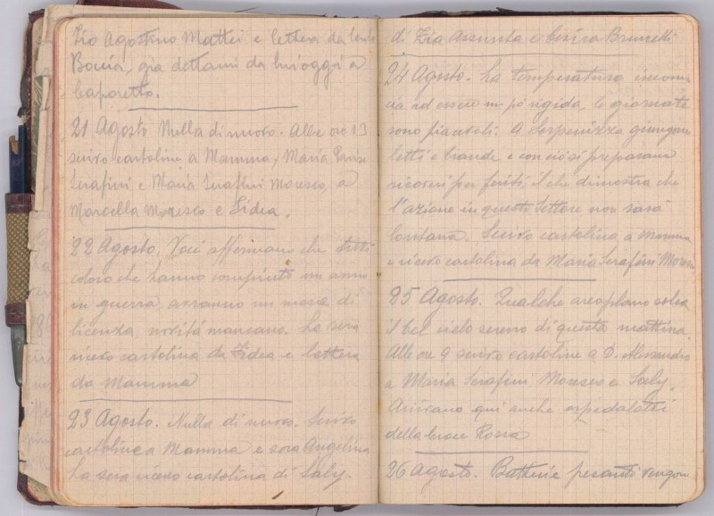 La mattinata è incerta, un dolore di testa non mi da pace. Alle ore 11 scrivo cartolina a Mamma a zia Assunta a Saly a Gentile Gaetano a Marcella Maresco…