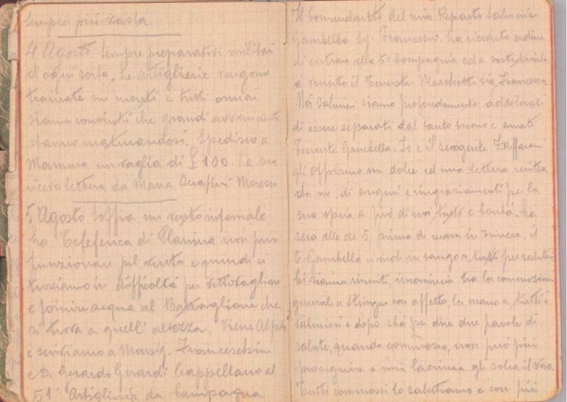Sempre preparativi militari di ogni sorta. Le artiglierie vengono trainate sui monti e tristi ormai siamo convinti che grandi avvenimenti stanno maturandosi. Spedisco a Mamma un vaglia di £ 100.…