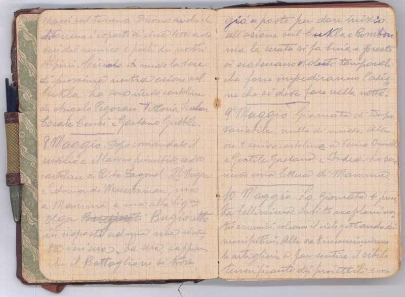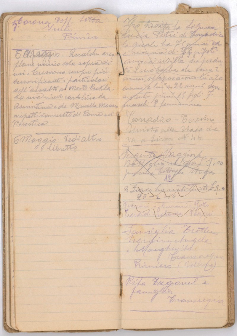 Qualche aeroplano nemico vola sopra di noi. Crescono sempre più terrificanti i particolari dell’assalto al Monte Cukla. La sera ricevo cartoline da Assuntina e da Marcella Moresco rispettivamente di Roma…