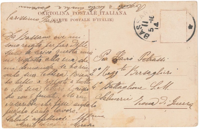 Piove sempre e siamo immersi nel fango. Verso Tolmino le artiglierie sono violente; qui calma relativa. Alle ore 4 scrivo cartoline a Mamma – Fidea – Angela Pegoraro – Maria…