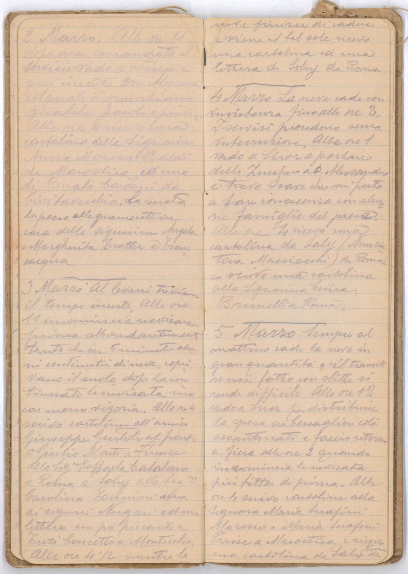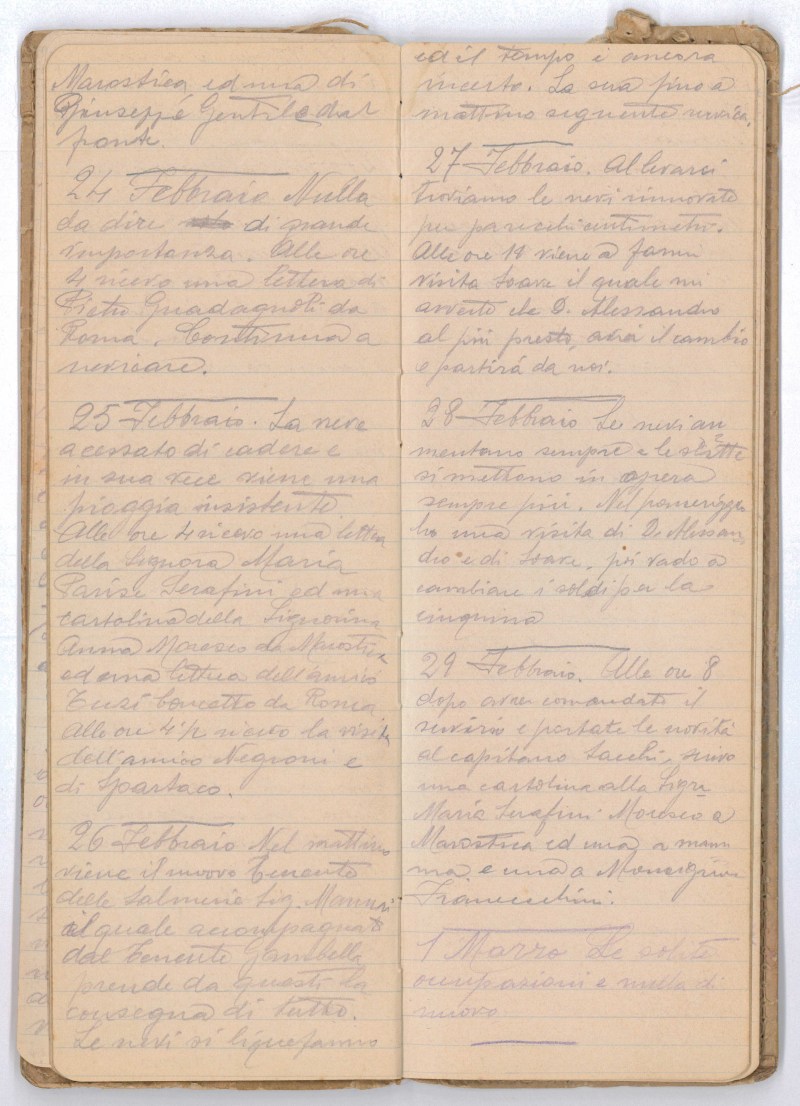 Sempre nevicate ma questa notte sembra stata più forte delle altre perché su quella neve vecchia si vedono parecchi centimetri della nuova. Alle ore 4 scrivo cartolina a mamma ed…