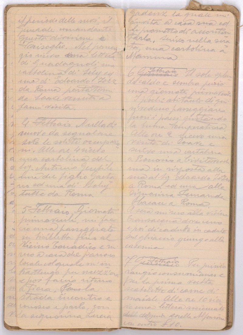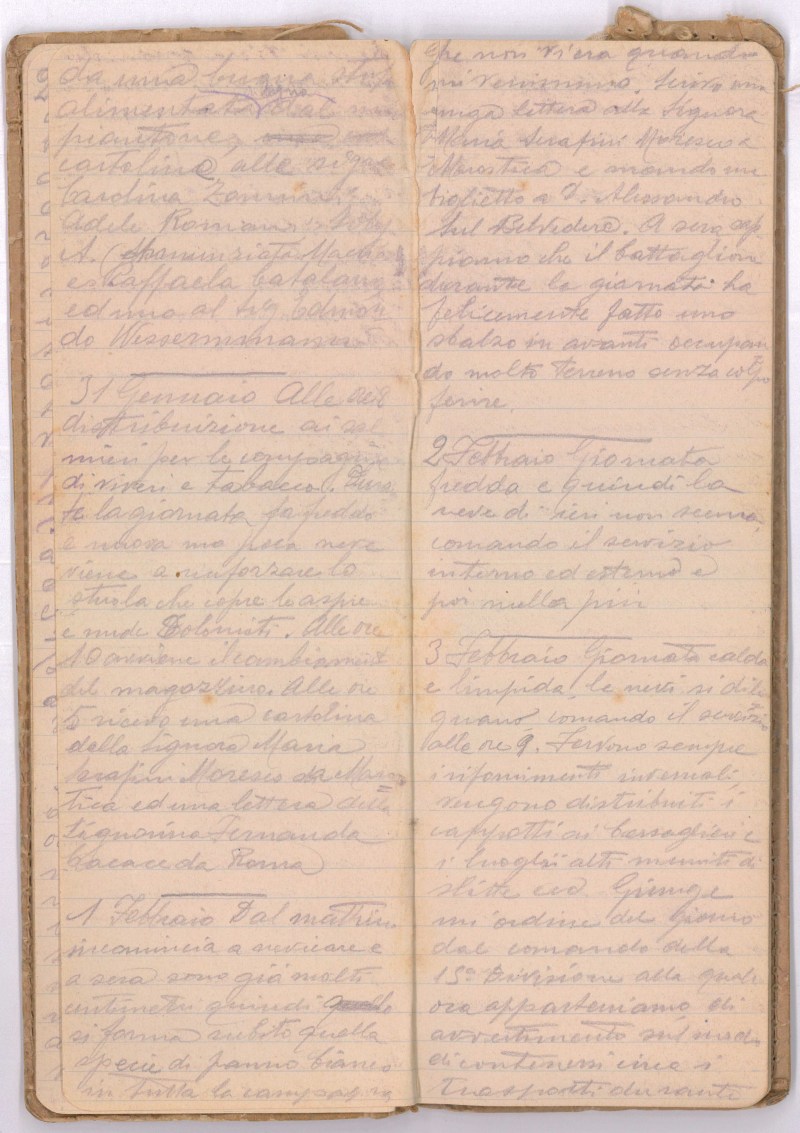 Giornata calda e limpida, le nevi si dileguano, comando il servizio alle ore 9. Fervono sempre i rifornimenti invernali, vengono distribuiti i cappotti ai bersaglieri e i luoghi [ndt. ?]…