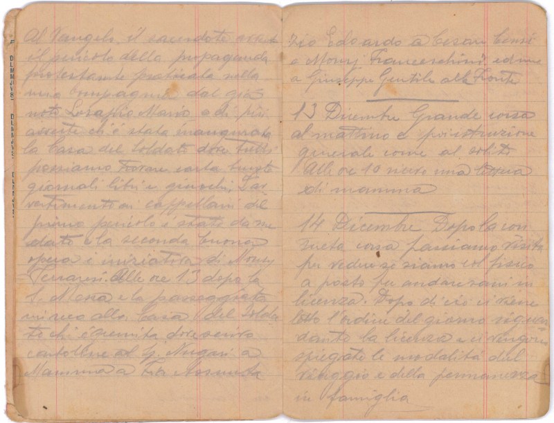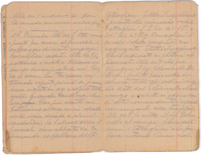 Alle ore 8 rivista del Colonnello. Alle ore 9 ricevo una cartolina del Sig. Romeo Nugari. Alle ore 11 libera uscita e … alla S. Messa che viene celebrata da…