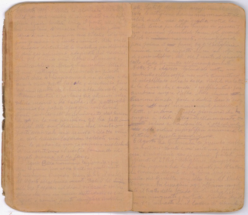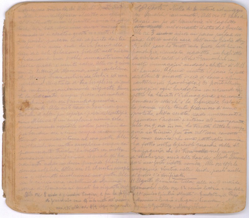 Mattinata di vero Agosto calma chiara e calda. Alle ore 7 un aeroplano vediamo volare tanto sul nostro fronte come su quello nemico, viene cannoneggiato. A distanza non so di…