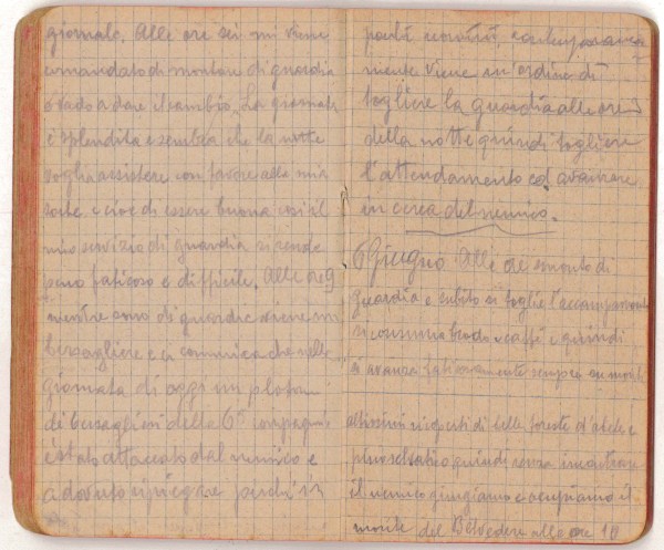 Alle ore […] monto di guardia e subito si toglie l’accampamento si consuma brodo e caffè e quindi si avanza faticosamente sempre sui monti altissimi ricoperti di belle foreste d’abete…
