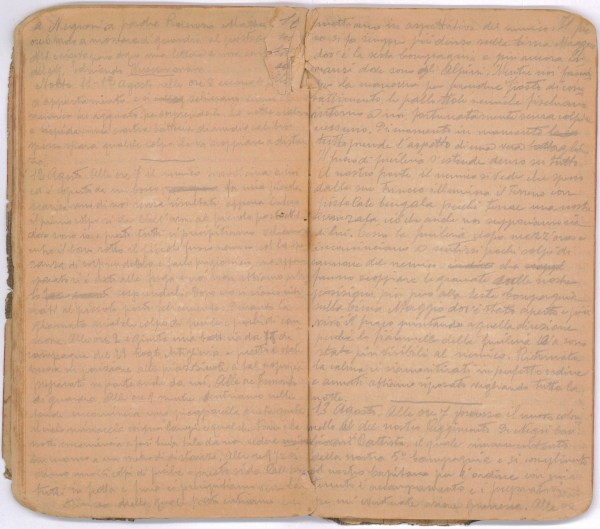 Mattinata di vero Agosto calma chiara e calda. Alle ore 7 un aeroplano vediamo volare tanto sul nostro fronte come su quello nemico, viene cannoneggiato. A distanza non so di…
