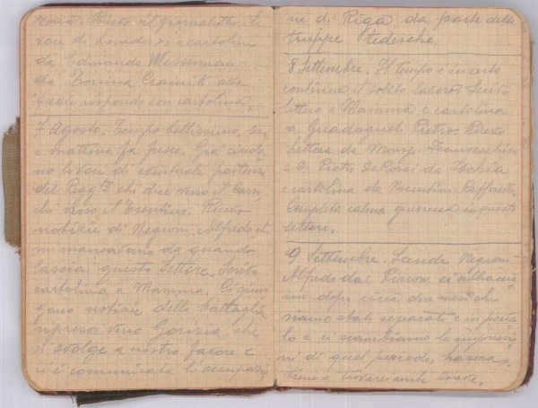 Caldo infernale, buone notizie dal resto del fronte. Alle ore 12 scrivo cartoline a Peppino gentile e Peppino Dubini. Arrivo degli Alpini destinati per la prossima azione sul Rombon.